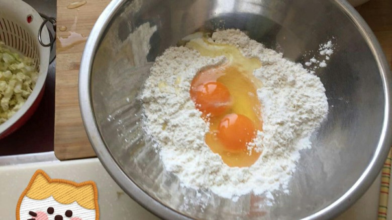 5. 卷心菜,香肠全部放入面糊中拌拌放点椒盐。