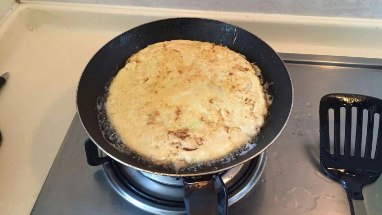 6. 小锅烧热,倒入油,放入面糊,小火慢煎。两分钟。