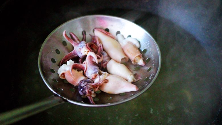 6. 最后再把笔管蛸焯水,看见笔管蛸变色即可捞出沥干水分。