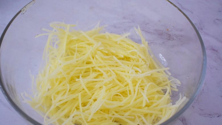 2. 土豆去皮擦成丝,再用清水洗去多余的淀粉,控干水分