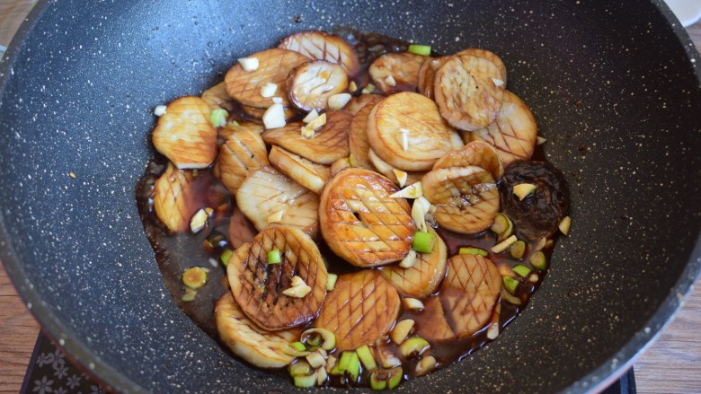 10. 锅中加油,加杏鲍菇煎至两面金黄