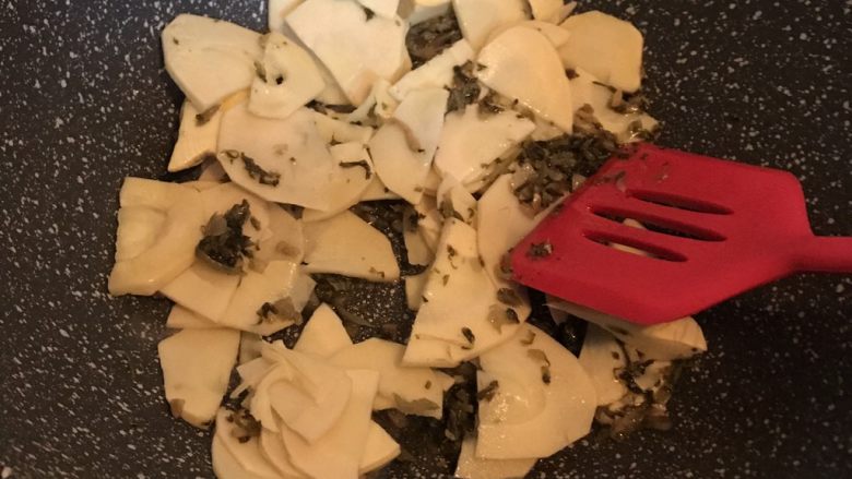 7. 油热后倒入雪菜煸炒
