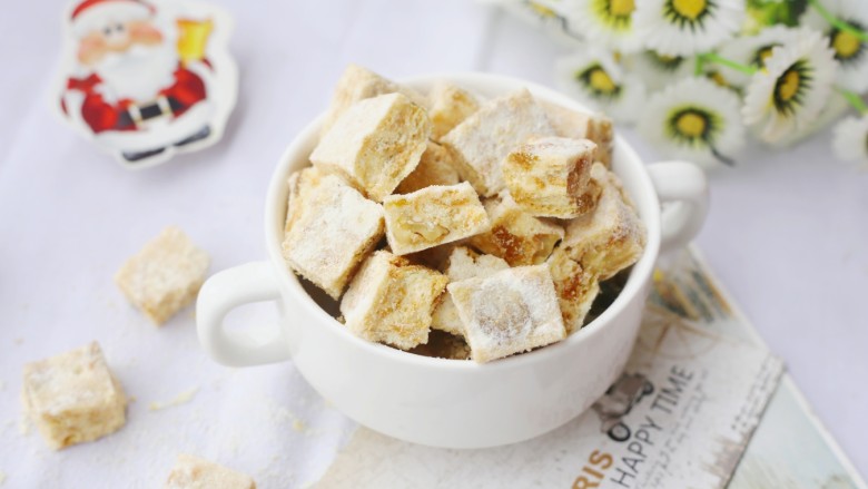 雪花酥流行了好久好久,经常看到有人在朋友圈晒,雪花酥被称为升级版的牛轧糖,味道可比牛轧糖好吃很多,完美的雪花酥,咸香和奶香交织,吃后有回香,而且越吃奶味越浓,堪称糖果和饼干结合的经典,作为宝宝的小零食太合适了。圣诞即将来临,忍不住也给宝宝做了一次雪花酥应应景,简简单单几步搞定,手残党都可以学会。