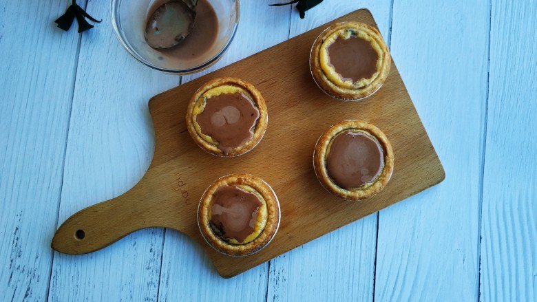 13. 烤制蛋挞时,将60g巧克力豆(自己喜欢的巧克力)与60g淡奶油隔水隔合成巧克力酱(有现成的巧克力酱可以忽略这步) 蛋挞烤好拿出