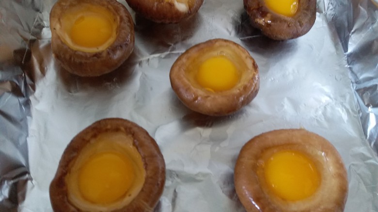 6. 烤盘内铺锡纸,香菇平铺在烤盘里,把鹌鹑蛋小心的磕在香菇内
