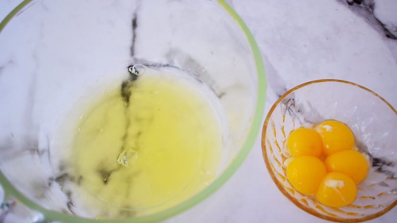 2. 蛋黄和蛋清分离在两个无水无油的盆中