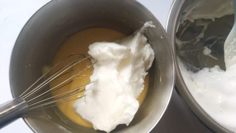 12. 冰箱取出冷藏的蛋白霜,先取一部分蛋白霜加入到蛋黄糊中,用蛋抽翻拌均匀