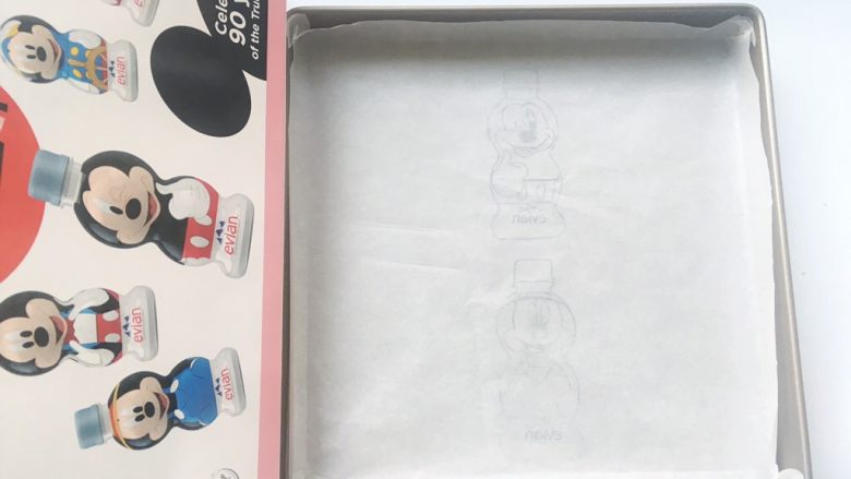 1. 准备一张比烤盘大一点的油纸,选两个喜欢的米奇米妮的图案画在油纸中间,两个图案之间要间隔一点点距离,之后将油纸铺在烤盘内,画画的一面朝下