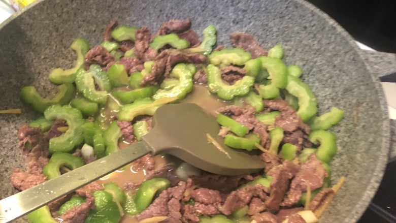 7. 然后加入苦瓜,加点水,再大火翻炒,再调咸淡。