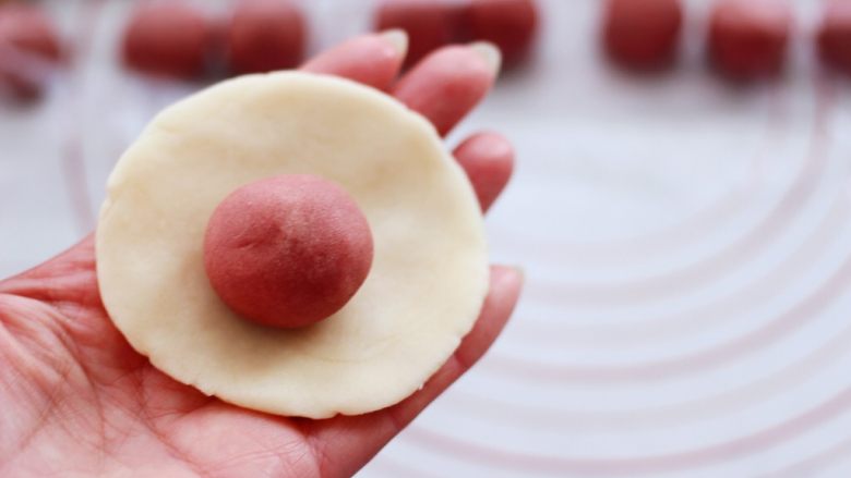9. 这个时候取一个水油皮按扁,擀圆,包入一个油酥。