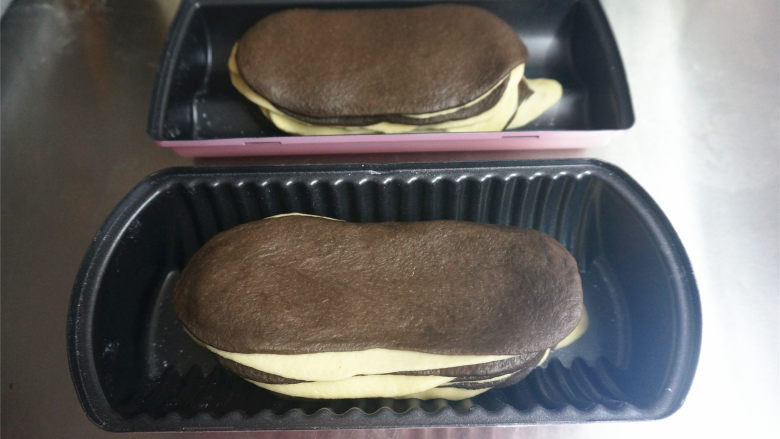 15. 把一个20克的黑色面团,25克的白色面团,25克的黑色面团,35克的白色面团,35克的黑色面团分别擀成长度厚度一致的面片,随着重量的增加,面片宽度也会增加。由小到大依次叠放进去。剩下的面团分别擀开,这次按照大到小的顺序依次叠放。重叠面皮时,左右侧稍微错开,图案更漂亮。