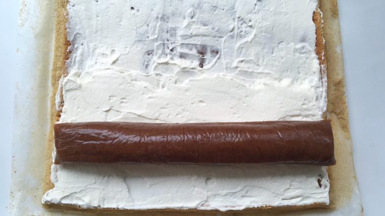 26. 之后利用擀面杖将蛋糕卷卷起,卷好后收紧油纸,给蛋糕卷定下形,之后放冰箱冷藏15分钟