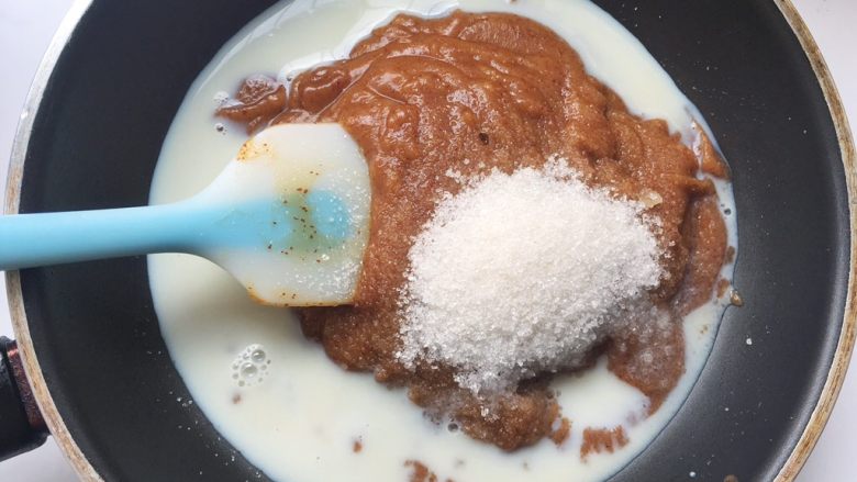 6. 剩下的枣泥刮干净,倒在不粘锅内,加30克砂糖跟牛奶