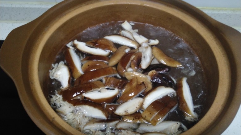 3. 锅中放入清水,水开后放入虾米、香菇。