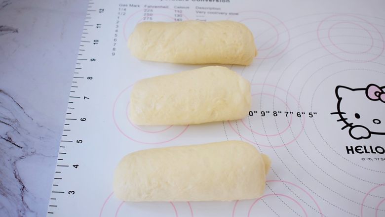 7. 取出面团排气后,平均分成3份,滚团盖保鲜膜松弛20分钟