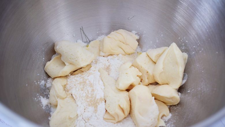 1. 把所有中种面团材料混合,揉成光滑的面团即可,盖上保鲜膜,放入冰箱冷藏发酵17小时,也可以头天晚上做好中种放入冰箱,第二天做面包