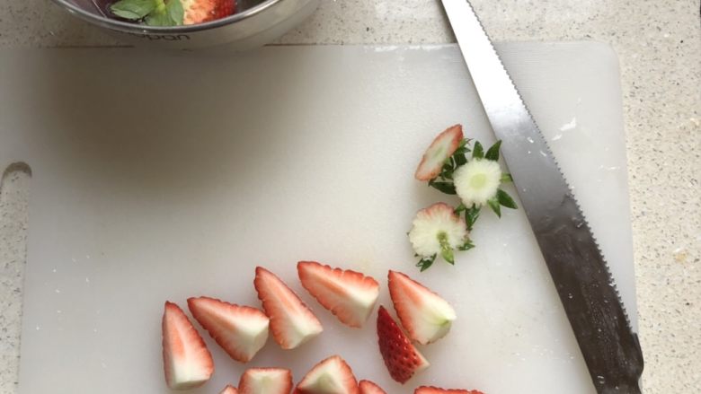 5. 倒入预热好的容器里,在上面铺一层草莓。