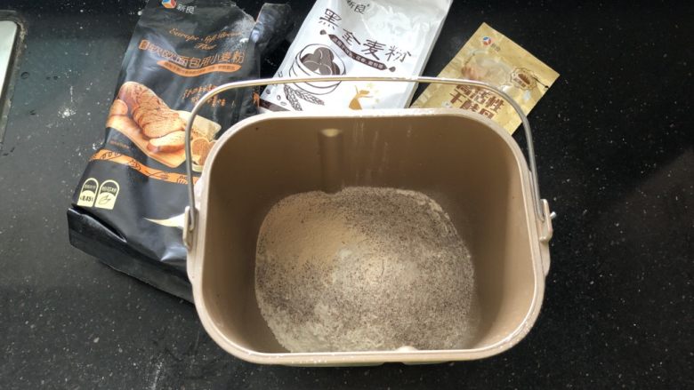 - 黑全麦粉 50克,高筋面粉 210克,水 140克,酵母粉 4克,白糖 30克,盐 2克,黄油 20克,有机花生碎 20克,蔓越梅干 10克