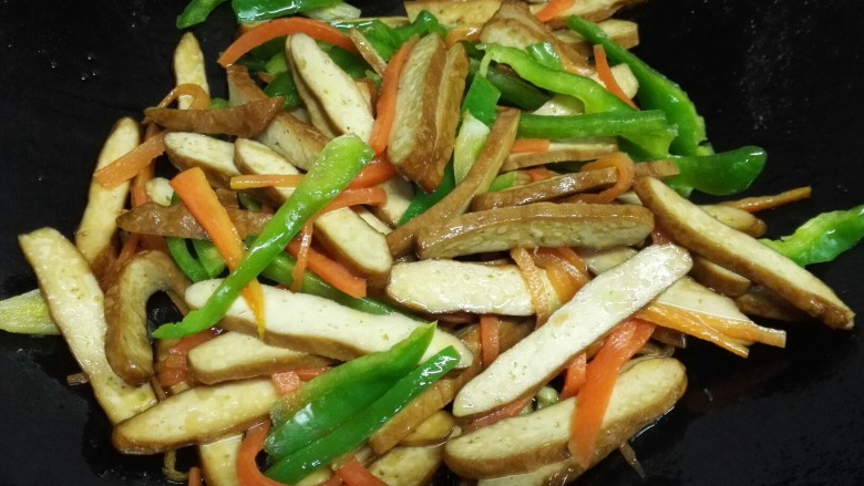 7. 翻炒一下后将豆腐干放入一同翻炒