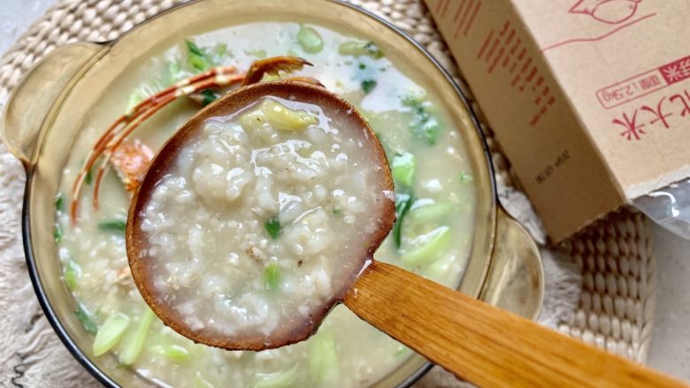12. 胚芽米新鲜、大龙虾肉洁白细嫩,加入青菜,煲成粥清透明亮、味道鲜美,营养丰富!