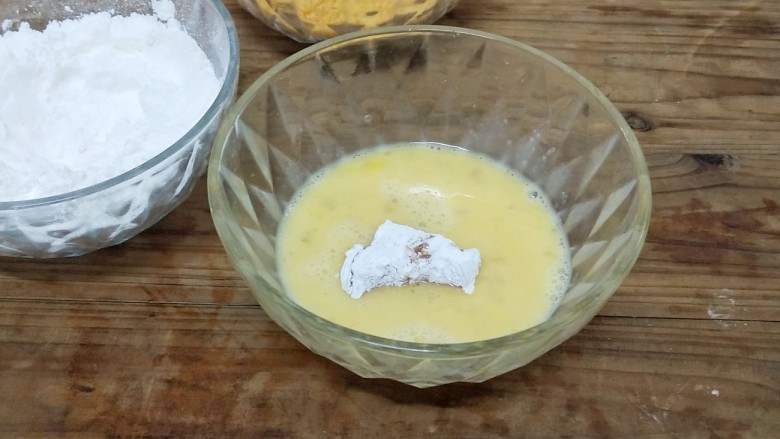 7. 再放入蛋液碗中转一圈,鸡蛋加淀粉的组合会形成一层无形的酥皮,吃起来才好吃