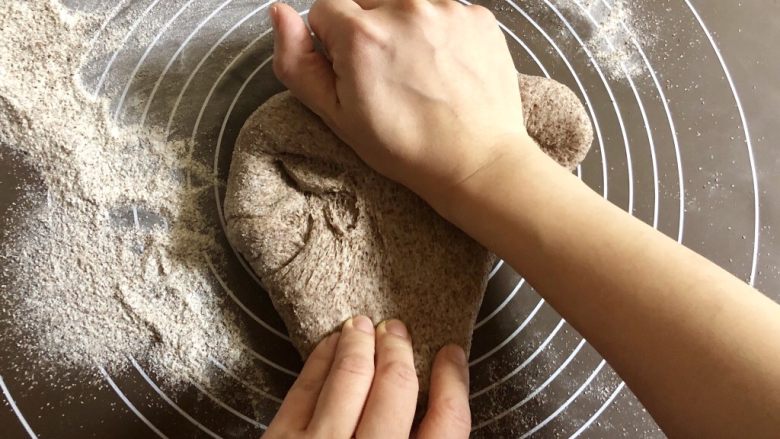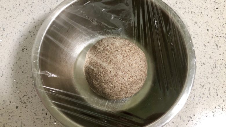 1. 把除了馅料以外的食材放入厨师机,揉成光滑的面团(由于黑全麦粉中有麦麸,所以揉好之后不会像精面团那样光滑,表面有颗粒感)