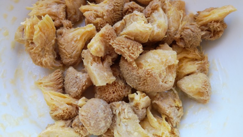 3. 将泡发好的猴头菇洗净挤干水份后撕成小块