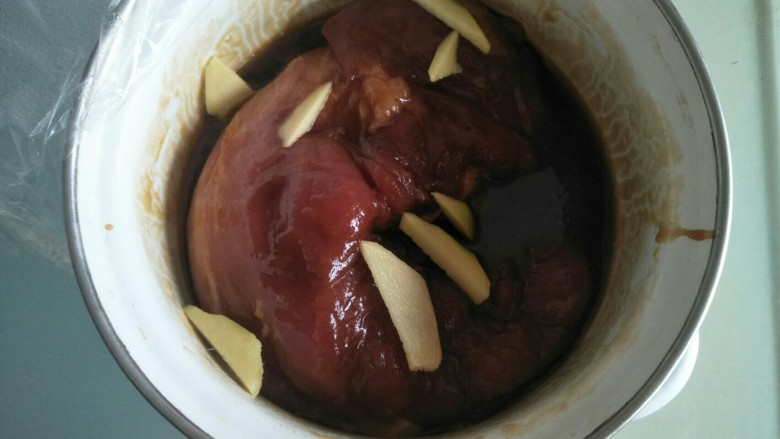 3. 放入姜盖保鲜膜腌制过夜。中途要翻转过来让肉每面到腌制均匀。