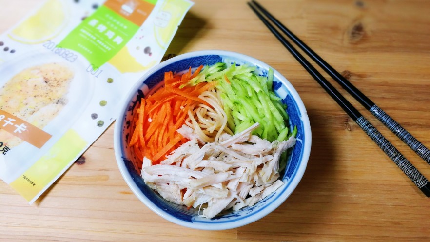 今天吃拌面,刚好有太阳谷蒸烤鸡胸,简单加热撕成丝,放点黄瓜丝,胡萝卜丝就是一碗美味午餐。