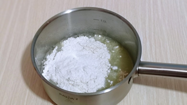 3. 将玉米油,纯净水,盐放入锅中,用手动打蛋器搅拌均匀。