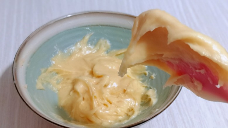 10. 将蛋液分三次倒入面团中,每加入一次蛋液后,“必须翻拌均匀,蛋液与面团完全融合在一起” 再加入蛋液,设计分三次加入蛋液,每次一定要拌均匀。