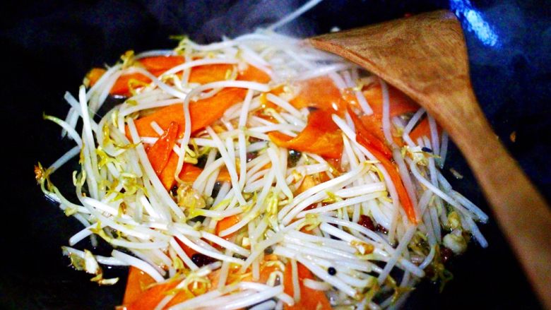 8. 再加入洗净的绿豆芽,继续大火进行翻炒片刻。