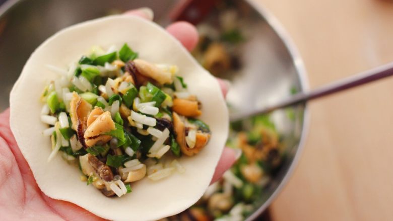 12. 把擀好的面皮里放入适量搅拌好的馅料。