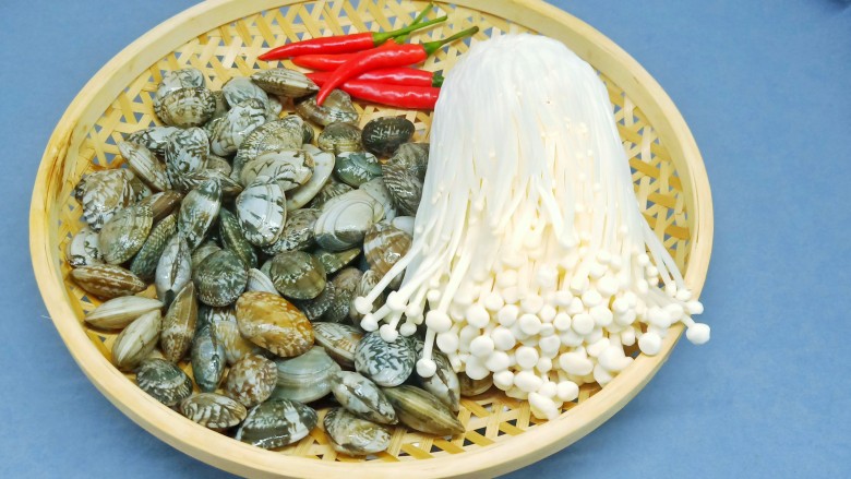 11. 浸泡好的花蛤多洗几遍,沥一下水分,码在金针菇上。