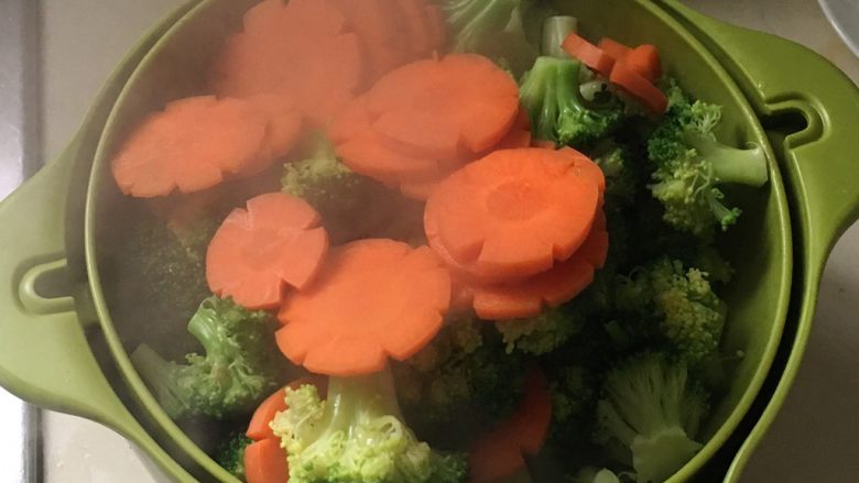 13. 加入西兰花、胡萝卜翻炒,可加入少许矿泉水