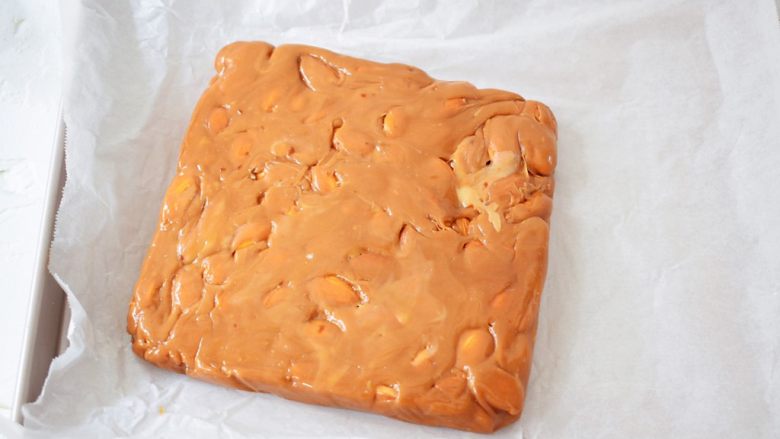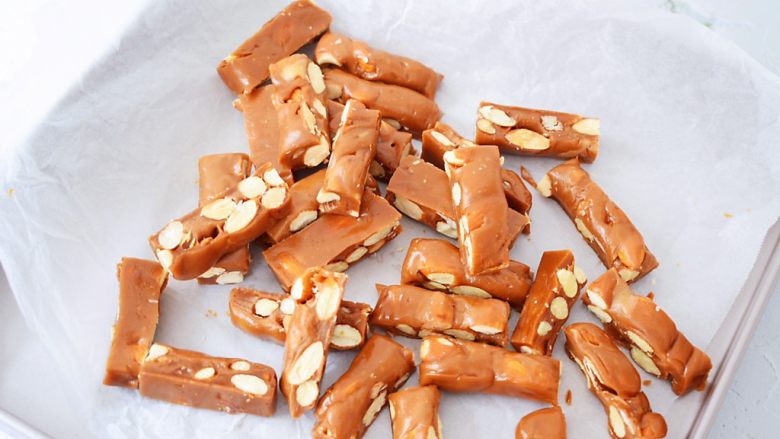 7. 烤盘铺上一张油纸,再把太妃糖放入