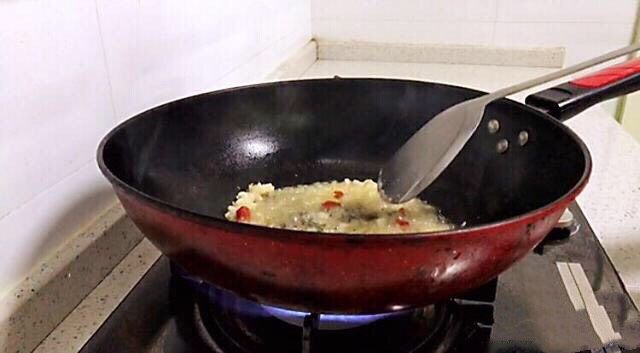4. 锅里放适量油,放蒜、洋葱、干红辣椒继续爆炒出香味。