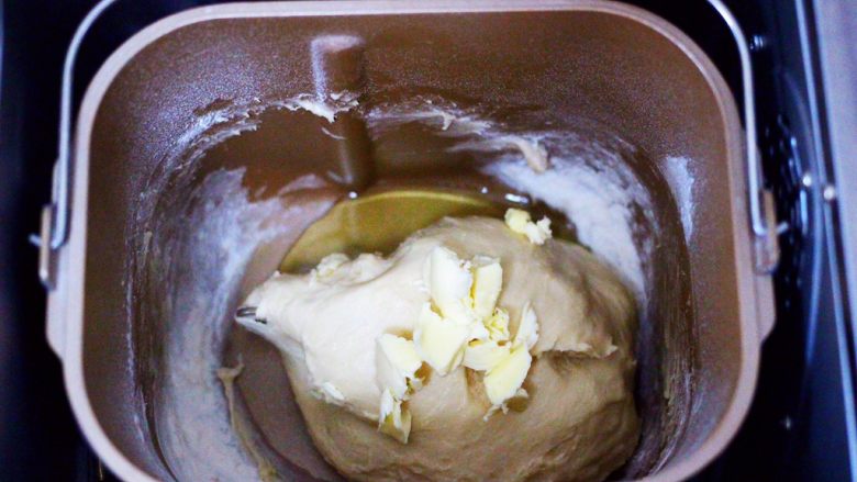 3. 启动东菱面包机一个和面模式后,加入室温软化的黄油,再次启动面包机,一个和面程序10分钟。