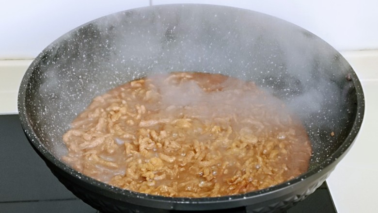9. 再加入半小碗纯净水,大火烧开快速翻炒,无需收汤,将肉丝炒熟即可关火出锅。