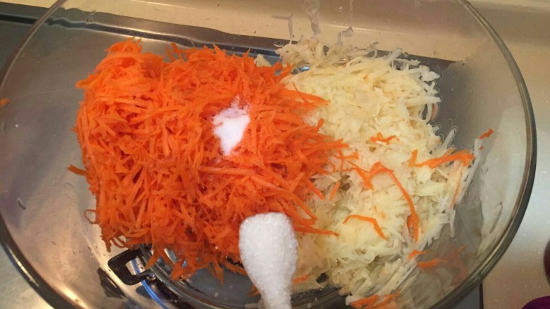 2. 胡萝卜和土豆都去皮刨成丝。