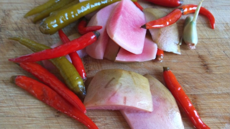 2. 我泡的是心里美萝卜厚一点的皮,红泡椒切碎,绿泡椒切碎,萝卜切碎。