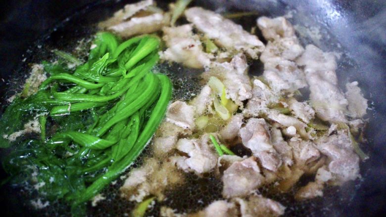14. 再煮30秒左右,看见羊肉卷变色断生的时候,把焯过水的菠菜放入锅中。