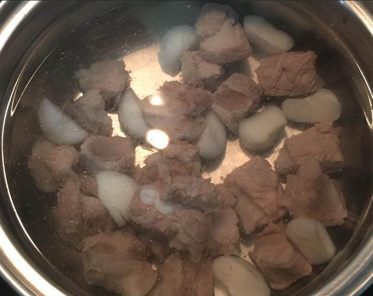 4. 将排骨川烫8分钟去血水,取出冲洗表面杂质备用。如直接加热水川烫,5分钟便可。