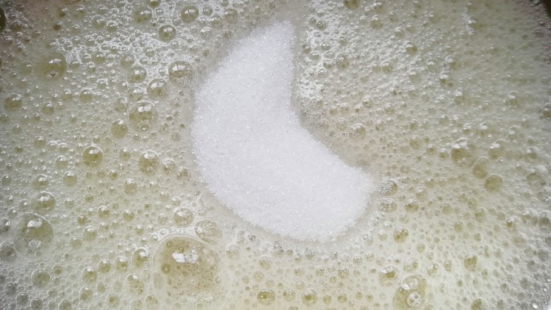 8. 低速打发至泡沫细腻,第二次加入15g细砂糖。