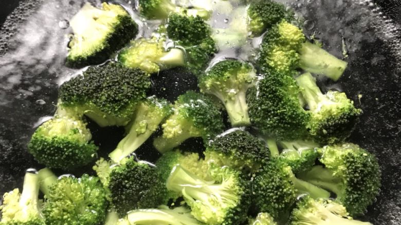 2. 烧一锅水加入盐和油汆烫椰菜花,汆烫时不需要盖锅盖,这样椰菜花颜色没这么翠绿。