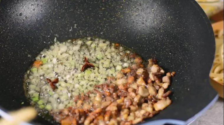 3. 热锅冷油,倒入肉丁,炒至边缘金黄,推至一边