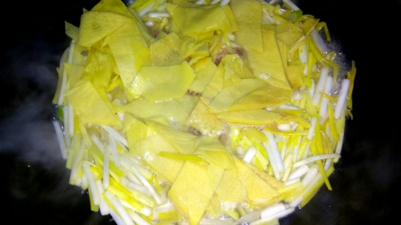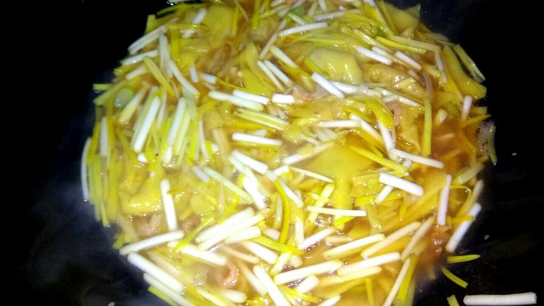 7. 放入蒜黄翻炒至断生