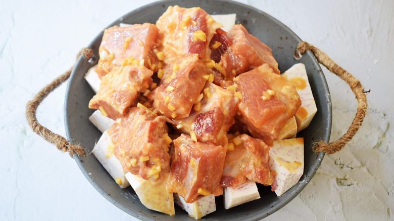 11. 芋头去皮洗净滚刀切块,铺上盘底备用