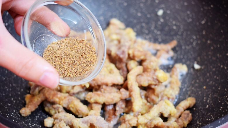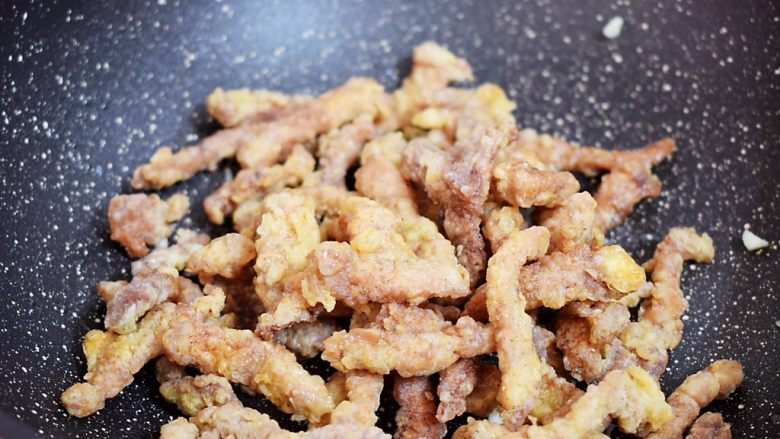 8. 锅中倒入适量的食用油烧至7-8成热,放入猪肉条,炸至淡黄色
