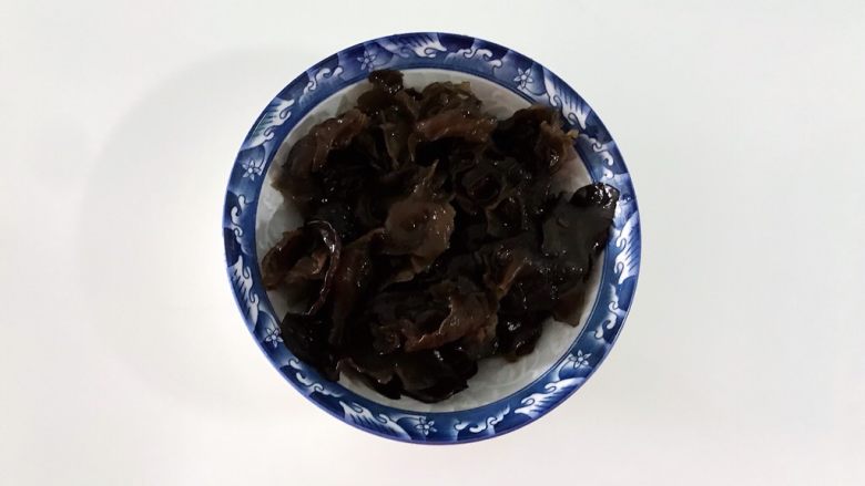 4. 木耳用凉水泡发,清洗干净去蒂,用手撕小备用。